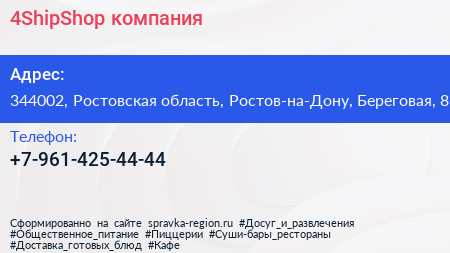 4ShipShop, компания по адресу 344002, Ростовская область, Ростов-на-Дону, Береговая, 8 в дальнейшем Организация, размещена в следующих категориях: