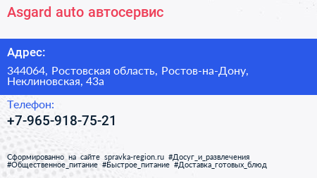 Asgard auto, автосервис по адресу 344064, Ростовская область, Ростов-на-Дону, Неклиновская, 43а в дальнейшем Организация, размещена в следующих категориях: