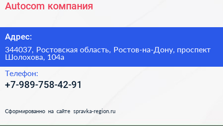 Autocom, компания по адресу 344037, Ростовская область, Ростов-на-Дону, проспект Шолохова, 104а в дальнейшем Организация, размещена в следующих категориях: