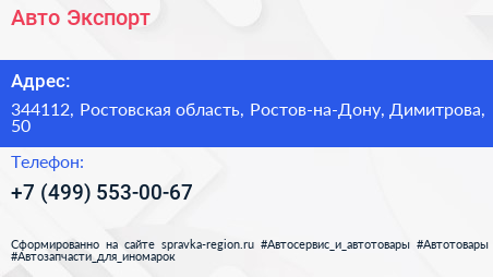 Авто-Экспорт по адресу 344112, Ростовская область, Ростов-на-Дону, Димитрова, 50 в дальнейшем Организация, размещена в следующих категориях:
