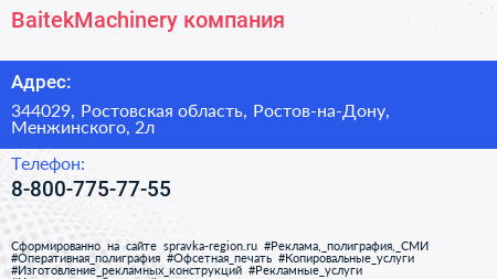BaitekMachinery, компания по адресу 344029, Ростовская область, Ростов-на-Дону, Менжинского, 2л в дальнейшем Организация, размещена в следующих категориях: