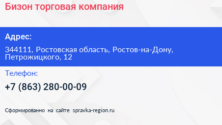 Бизон, торговая компания по адресу 344111, Ростовская область, Ростов-на-Дону, Петрожицкого, 12 в дальнейшем Организация, размещена в следующих категориях: