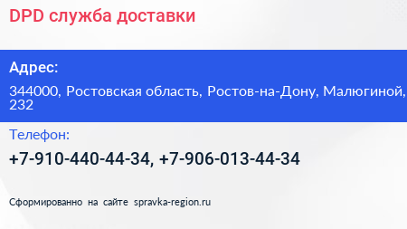 DPD, служба доставки по адресу 344000, Ростовская область, Ростов-на-Дону, Малюгиной, 232 в дальнейшем Организация, размещена в следующих категориях: