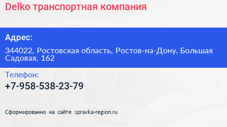 Delko, транспортная компания по адресу 344022, Ростовская область, Ростов-на-Дону, Большая Садовая, 162 в дальнейшем Организация, размещена в следующих категориях: