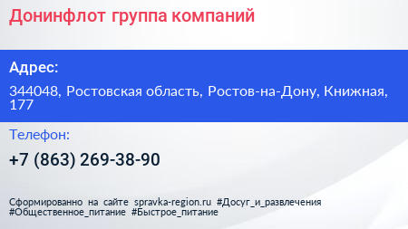 Донинфлот, группа компаний по адресу 344048, Ростовская область, Ростов-на-Дону, Книжная, 177 в дальнейшем Организация, размещена в следующих категориях: