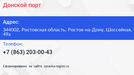 Донской порт по адресу 344002, Ростовская область, Ростов-на-Дону, Шоссейная, 49а в дальнейшем Организация, размещена в следующих категориях: