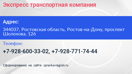 Экспресс, транспортная компания по адресу 344037, Ростовская область, Ростов-на-Дону, проспект Шолохова, 126 в дальнейшем Организация, размещена в следующих категориях:
