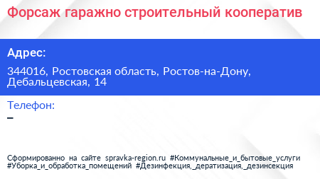 Форсаж, гаражно-строительный кооператив по адресу 344016, Ростовская область, Ростов-на-Дону, Дебальцевская, 14 в дальнейшем Организация, размещена в следующих категориях: