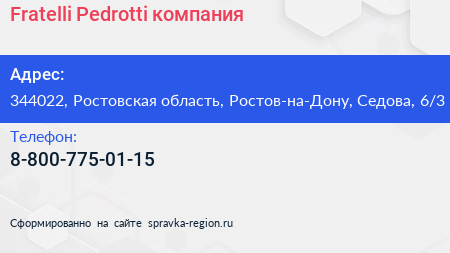 Fratelli Pedrotti, компания по адресу 344022, Ростовская область, Ростов-на-Дону, Седова, 6/3 в дальнейшем Организация, размещена в следующих категориях: