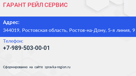 ГАРАНТ РЕЙЛ СЕРВИС по адресу 344019, Ростовская область, Ростов-на-Дону, 5-я линия, 9 в дальнейшем Организация, размещена в следующих категориях: