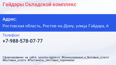 Гайдары, Складской комплекс по адресу Ростовская область, Ростов-на-Дону, улица Гайдара, 6 в дальнейшем Организация, размещена в следующих категориях: