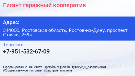 Гигант, гаражный кооператив по адресу 344000, Ростовская область, Ростов-на-Дону, проспект Стачки, 259а в дальнейшем Организация, размещена в следующих категориях: