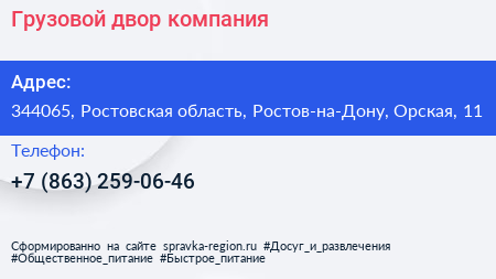 Грузовой двор, компания по адресу 344065, Ростовская область, Ростов-на-Дону, Орская, 11 в дальнейшем Организация, размещена в следующих категориях: