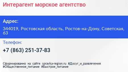 Интерагент, морское агентство по адресу 344019, Ростовская область, Ростов-на-Дону, Советская, 63 в дальнейшем Организация, размещена в следующих категориях: