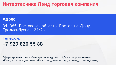 Интертехника Лэнд, торговая компания по адресу 344065, Ростовская область, Ростов-на-Дону, Троллейбусная, 24/2в в дальнейшем Организация, размещена в следующих категориях: