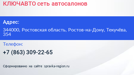 КЛЮЧАВТО, сеть автосалонов по адресу 344000, Ростовская область, Ростов-на-Дону, Текучёва, 354 в дальнейшем Организация, размещена в следующих категориях: