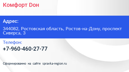 Комфорт Dон по адресу 344082, Ростовская область, Ростов-на-Дону, проспект Сиверса, 3 в дальнейшем Организация, размещена в следующих категориях: