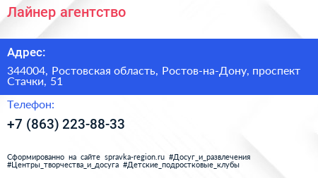 Лайнер, агентство по адресу 344004, Ростовская область, Ростов-на-Дону, проспект Стачки, 51 в дальнейшем Организация, размещена в следующих категориях: