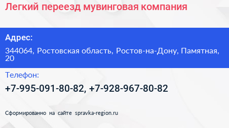 Легкий переезд, мувинговая компания по адресу 344064, Ростовская область, Ростов-на-Дону, Памятная, 20 в дальнейшем Организация, размещена в следующих категориях: