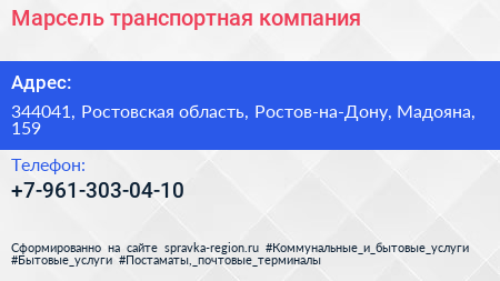 Марсель, транспортная компания по адресу 344041, Ростовская область, Ростов-на-Дону, Мадояна, 159 в дальнейшем Организация, размещена в следующих категориях: