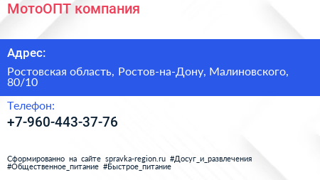 МотоОПТ, компания по адресу Ростовская область, Ростов-на-Дону, Малиновского, 80/10 в дальнейшем Организация, размещена в следующих категориях: