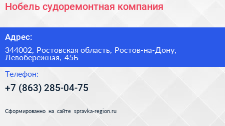 Нобель, судоремонтная компания по адресу 344002, Ростовская область, Ростов-на-Дону, Левобережная, 45Б в дальнейшем Организация, размещена в следующих категориях: