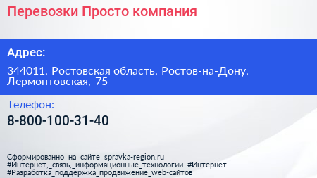 Перевозки Просто, компания по адресу 344011, Ростовская область, Ростов-на-Дону, Лермонтовская, 75 в дальнейшем Организация, размещена в следующих категориях: