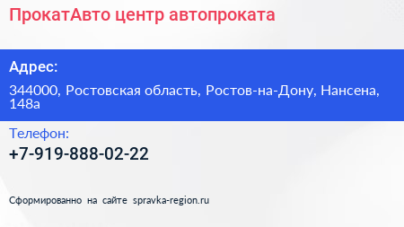 ПрокатАвто, центр автопроката по адресу 344000, Ростовская область, Ростов-на-Дону, Нансена, 148а в дальнейшем Организация, размещена в следующих категориях: