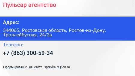 Пульсар, агентство по адресу 344065, Ростовская область, Ростов-на-Дону, Троллейбусная, 24/2в в дальнейшем Организация, размещена в следующих категориях: