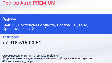 Ростов Авто PREMIUM по адресу 344091, Ростовская область, Ростов-на-Дону, Краснодарская 2-я, 112 в дальнейшем Организация, размещена в следующих категориях: