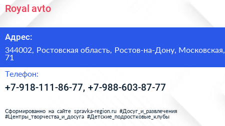 Royal avto по адресу 344002, Ростовская область, Ростов-на-Дону, Московская, 71 в дальнейшем Организация, размещена в следующих категориях: