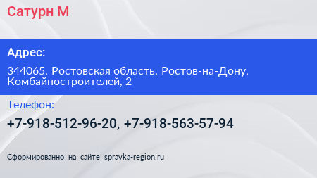 Сатурн-М по адресу 344065, Ростовская область, Ростов-на-Дону, Комбайностроителей, 2 в дальнейшем Организация, размещена в следующих категориях: