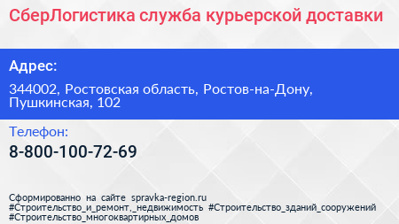 СберЛогистика, служба курьерской доставки по адресу 344002, Ростовская область, Ростов-на-Дону, Пушкинская, 102 в дальнейшем Организация, размещена в следующих категориях: