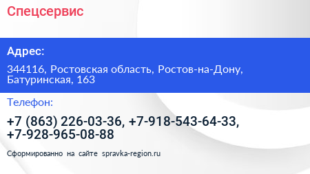Спецсервис по адресу 344116, Ростовская область, Ростов-на-Дону, Батуринская, 163 в дальнейшем Организация, размещена в следующих категориях: