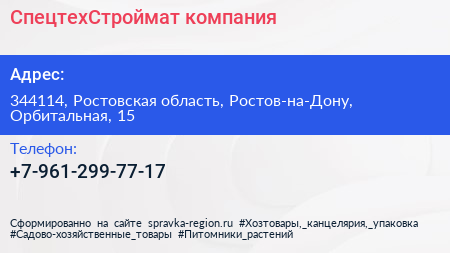 СпецтехСтроймат, компания по адресу 344114, Ростовская область, Ростов-на-Дону, Орбитальная, 15 в дальнейшем Организация, размещена в следующих категориях: