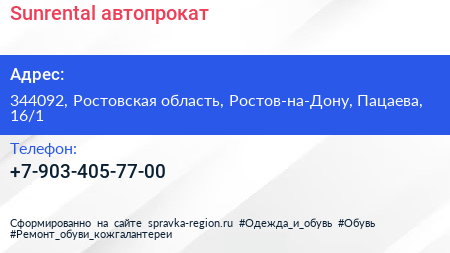 Sunrental, автопрокат по адресу 344092, Ростовская область, Ростов-на-Дону, Пацаева, 16/1 в дальнейшем Организация, размещена в следующих категориях: