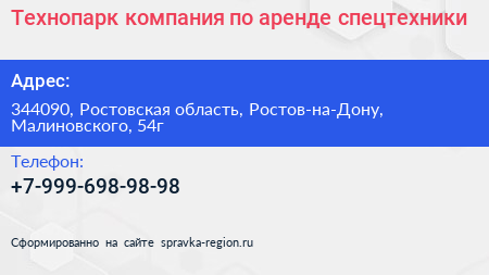 Технопарк, компания по аренде спецтехники по адресу 344090, Ростовская область, Ростов-на-Дону, Малиновского, 54г в дальнейшем Организация, размещена в следующих категориях: