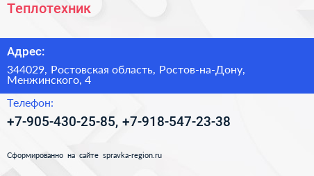 Теплотехник+ по адресу 344029, Ростовская область, Ростов-на-Дону, Менжинского, 4 в дальнейшем Организация, размещена в следующих категориях: