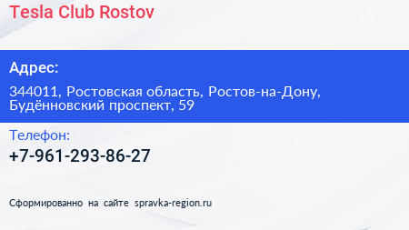Tesla Club Rostov по адресу 344011, Ростовская область, Ростов-на-Дону, Будённовский проспект, 59 в дальнейшем Организация, размещена в следующих категориях: