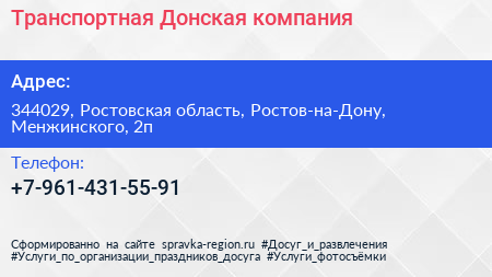 Транспортная Донская компания по адресу 344029, Ростовская область, Ростов-на-Дону, Менжинского, 2п в дальнейшем Организация, размещена в следующих категориях: