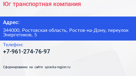 Юг, транспортная компания по адресу 344000, Ростовская область, Ростов-на-Дону, переулок Энергетиков, 5 в дальнейшем Организация, размещена в следующих категориях: