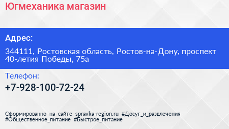 Югмеханика, магазин по адресу 344111, Ростовская область, Ростов-на-Дону, проспект 40-летия Победы, 75а в дальнейшем Организация, размещена в следующих категориях: