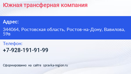 Южная трансферная компания по адресу 344064, Ростовская область, Ростов-на-Дону, Вавилова, 59в в дальнейшем Организация, размещена в следующих категориях: