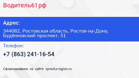 Водитель61.рф по адресу 344082, Ростовская область, Ростов-на-Дону, Будённовский проспект, 51 в дальнейшем Организация, размещена в следующих категориях: