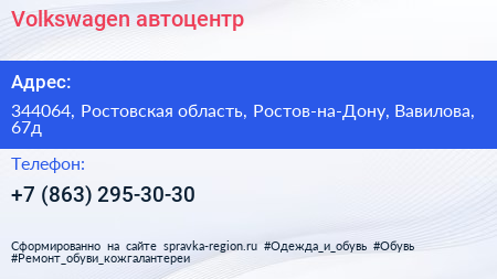 Volkswagen, автоцентр по адресу 344064, Ростовская область, Ростов-на-Дону, Вавилова, 67д в дальнейшем Организация, размещена в следующих категориях: