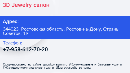 3D-Jewelry, салон по адресу 344023, Ростовская область, Ростов-на-Дону, Страны Советов, 19 в дальнейшем Организация, размещена в следующих категориях: