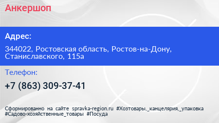 Анкершоп по адресу 344022, Ростовская область, Ростов-на-Дону, Станиславского, 115а в дальнейшем Организация, размещена в следующих категориях:
