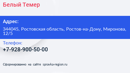 Белый Темер по адресу 344045, Ростовская область, Ростов-на-Дону, Миронова, 12/5 в дальнейшем Организация, размещена в следующих категориях: