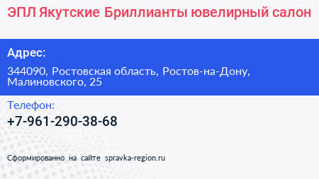 ЭПЛ Якутские Бриллианты, ювелирный салон по адресу 344090, Ростовская область, Ростов-на-Дону, Малиновского, 25 в дальнейшем Организация, размещена в следующих категориях: