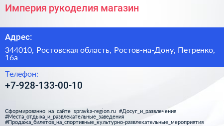 Империя рукоделия, магазин по адресу 344010, Ростовская область, Ростов-на-Дону, Петренко, 16а в дальнейшем Организация, размещена в следующих категориях: